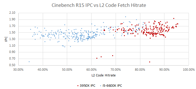 Instruction fetch latency can be a problem if we get a lot of L1i misses. But the correlation here looks weak too, with a curious V-like pattern where portions of the benchmark with lower L1i hitrate actually get better IPC. Plotting L1i misses per instruction instead of hitrate doesn’t change the picture much. We don’t see instruction cache misses strongly affect IPC until L2 is missed as well (as discussed above). Perhaps both CPUs have deep enough frontend queues to absorb the latency of a L2 hit.